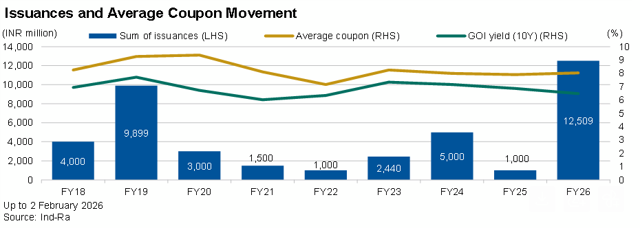 ULBs are still testing the waters with issuance sizes largely limited to INR2,000 million. The coupon rates for municipal bond issuances during FY18–10MFY26 was in the range of 7.15%-10.23%. The average spread of municipal bonds over the 10-year government of India (GoI) yield was 142bp during FY18 to 10MFY26. Bond pricing continues to be influenced by several factors, including the prevailing interest rate environment, bond tenure, credit rating, inflation expectations, and liquidity of the bond.