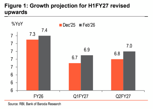 • Growth is now expected at 6.9% in Q1FY27 (6.8% in Dec’25 policy) and at 7% in Q2FY27 (6.8%).