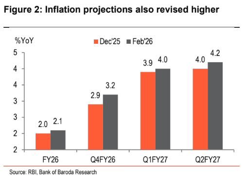 • It now expects FY26 CPI at 2.1% (+10bps from Dec’25 policy), driven by higher inflation in Q4FY26 at 3.2% (+30bps). In Q1FY27 as well, CPI will rise to 4% (+10bps) and in Q2 it will increase to 4.2% (+20bps).