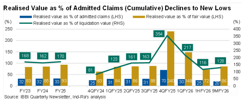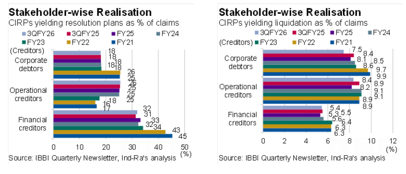 Realisations Likely to Stay Weak, despite Higher Resolution Counts: The insolvency system will continue to produce low realisation values because its fundamental structural problems remain unaddressed, according to Ind-Ra. The Standing Committee on Finance reports that the Insolvency and Bankruptcy Code (IBC) has made progress in insolvency results yet the system continues to suffer from delayed proceedings and insufficient asset valuation which lowers recovery funds. The framework needs better institutional strength and transparent operations together with simplified procedures which should serve small businesses and their micro and medium-sized enterprise counterparts. The current situation remains aligned with Ind-Ra’s assessment because Indian recoveries depend on how well organizations perform their duties instead of the strength of statutory measures like IBC. The third quarter of FY26 showed that resolution cases reached 1.6 times the number of liquidation cases which had been at 0.7 times during the previous quarter, thus showing a growing difference between resolution numbers and recovery values.