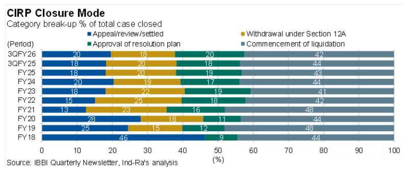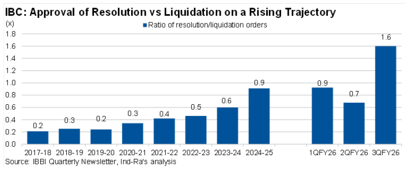 Resolution Preference to Deepen as Creditors Prioritise Value Preservation: Ind-Ra predicts creditors will choose resolutions instead of liquidations because they tend to resolve matters through restructuring which led to a 1.6x resolution-to-liquidation ratio in 3QFY26 (2QFY26: 0.7x). The credit ratio showed a sudden increase during this quarter but it could prove to be a temporary spike. The ratio has been moving upward and a ratio above 1x for an extended period would demonstrate that creditors have developed their strategies and they trust resolution methods more than before.