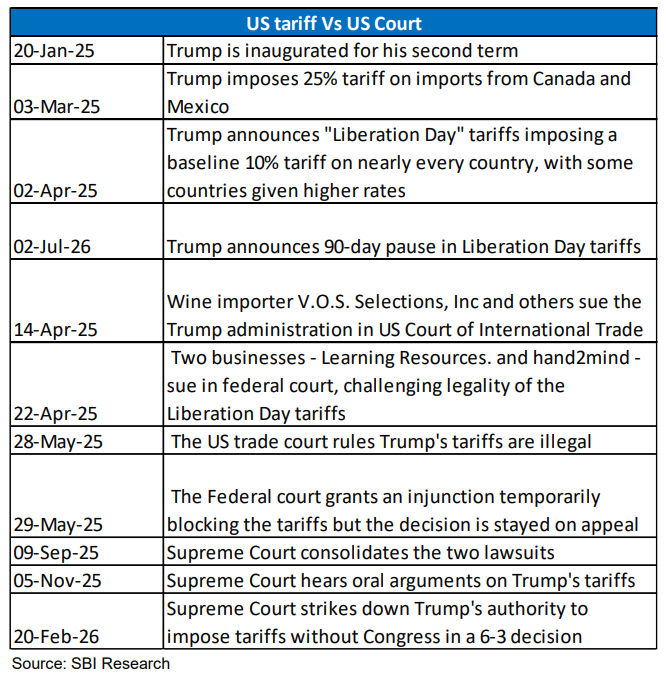 On February 20, 2026, the US Supreme Court issued a landmark decision that invalidated the POTUS/Administration’s use of imposing tariffs under the International Emergency Economic Powers Act (IEEPA), 1977. The act had never before been used by a President to impose tariffs and does not find much footing in peacetime. However, the executive has quickly invoked Section 122 of the 1974 Trade Act to impose new 10% global tariff on all imports to US for 150 days (note: this will be the first time Section 122 authority has ever been used). This temporary measure will start from 24 Feb 2026 and ends in July should the Congress not ratify the imposition, according to SBI Research.