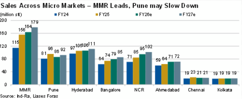 Mumbai Metropolitan Region (MMR) forms the largest micro-market, with a 26% share in the top eight real estate clusters, followed by Hyderabad at 16%. Bengaluru, Ahmedabad and MMR posted the highest sales growth of 15% to 17% yoy during TTM1HFY26, closely followed by NCR. Pune, Chennai and Hyderabad posted negative to 5% yoy growth. Within the cities, Hyderabad, Pune, and MMR posted strong sales growth with a CAGR exceeding 17% during FY20-FY25. Sales growth in Bengaluru, NCR, Chennai, Ahmedabad, and Kolkata remained below the average five-year CAGR; hence, they may post better than average sales growth in FY27. Given entry-level hiring moderation in IT services and AI-driven efficiency gains, unit absorption in tech-linked corridors could see elongated decision cycles in FY27, despite a healthy end-user intent, with mid-market remaining stickier.