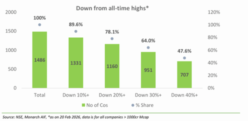 Indian markets have witnessed a phase of time and value correction in last 18 months (since Sep 2024) with a peculiar phenomenon where broader listed universe is in bear market territory while indices are staying near all-time/52w highs. The correction has been very sharp on the broader base of stocks in the small and midcap segment (SMIDs) of the market and the fall has accelerated in recent months, according to the latest report from Monarch AIF.