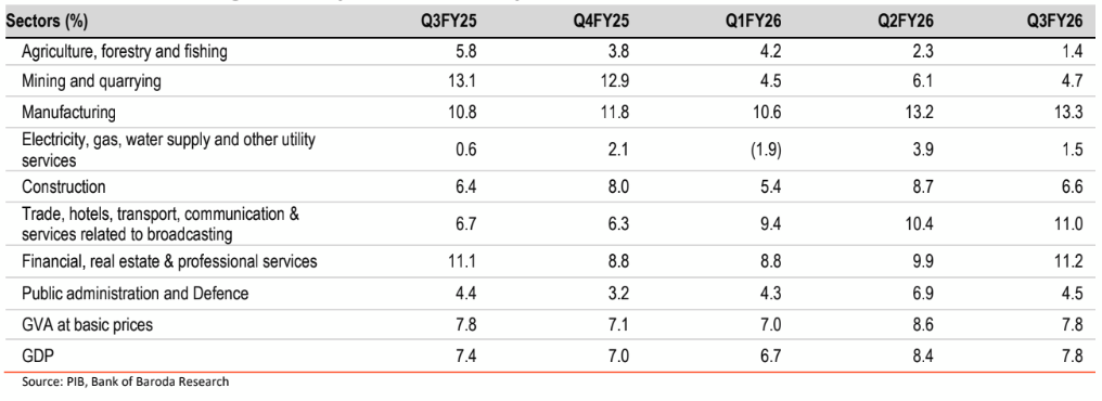 India’s GDP growth was recorded at 7.8% in Q3FY26, following a 7.4% growth in Q3FY25. For the full year, growth is estimated at 7.6%, supported by robust expansion in the manufacturing sector. The estimates have been revised upwards from the previous estimate of 7.4% to align with the new base year (2022-23). With respect to the revision, major changes that have been incorporated include double deflation in agriculture and manufacturing in order to capture price issues appropriately, according to a report by the Bank of Baroda.