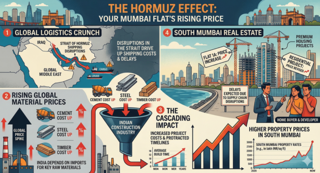 Shipping disruptions and rising input costs triggered by the Strait of Hormuz crisis are set to push up construction costs, impacting luxury housing prices in South Mumbai.
