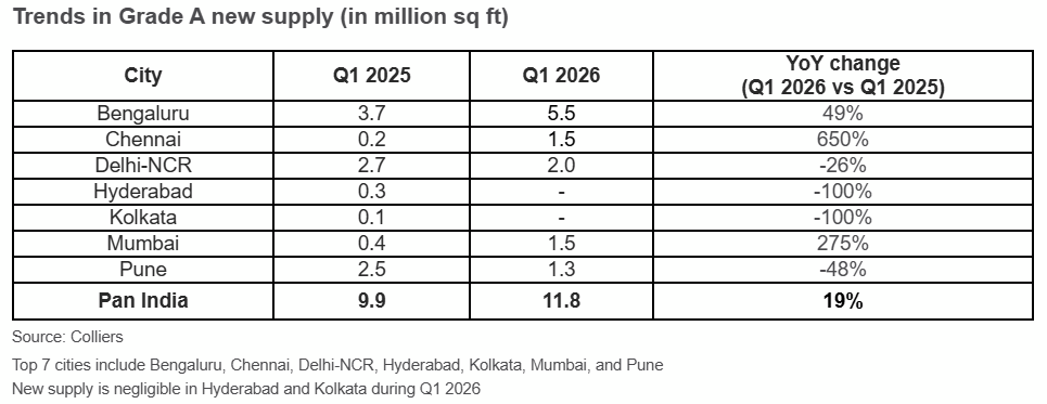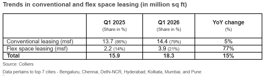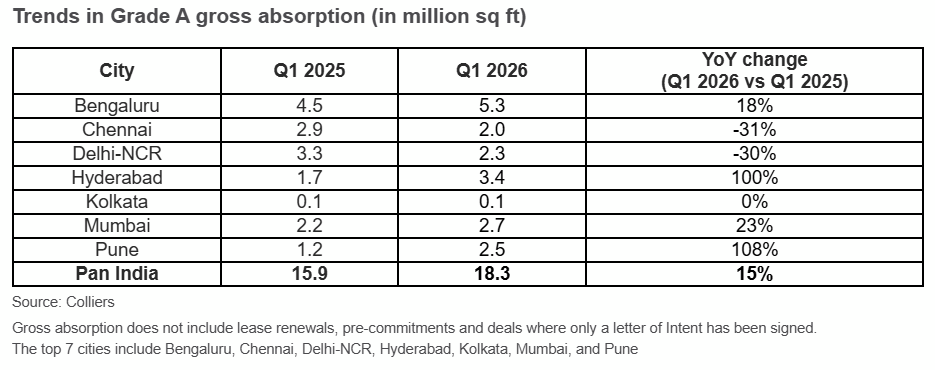 India’s office market across the top seven cities has started on a strong note in 2026, registering 18.3 million sq ft of leasing activity in the first quarter, up by 15% year-on-year (YoY). This continued momentum has been supported by strengthening occupier demand across sectors and expanding Global Capability Centers (GCCs) footprint, despite ongoing global uncertainties. Bengaluru, followed by Hyderabad, together accounted for nearly half of the quarterly leasing activity, cumulatively contributing 8.7 million sq ft of demand. Meanwhile, Grade A space uptake was firm in cities like Mumbai, Pune, Delhi NCR and Chennai, with each of them witnessing leasing in the range of 2-3 million sq ft. Interestingly, office space demand in Hyderabad and Pune more than doubled on an annual basis during Q1 2026, according to Colliers India.
