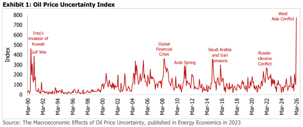 Given the time required to restore these capacities and the threat of further disruptions, energy prices are likely to remain elevated even if the conflict de-escalates early in FY27. The West Asia crisis has created significant uncertainty around global oil prices and availability (Refer Exhibit 1). Given the prolonged nature of the conflict and rising risks of disruptions, our projections for the Indian economy have been revised from our previous assessment following the outbreak of the conflict.