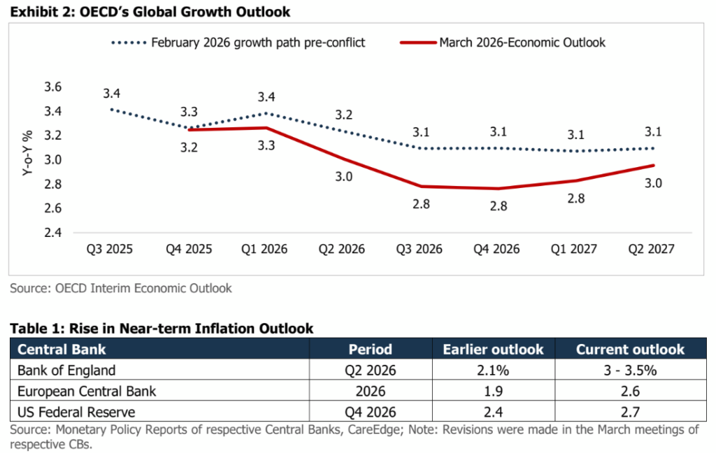 The recent OECD projections of growth and inflation reveal the extent of the conflict’s impact. The OECD projects global growth to moderate to 2.9% in 2026 from the estimated 3.3% in 2025. Quarterly projections of global growth throughout 2026 are expected to be lower than the pre-conflict growth path (Refer to Exhibit 2). Inflation in G20 countries is expected to increase to 4% in 2026 from an estimated 3.4% in 2025. Inflationary concerns have led some major central banks to revise their near-to-medium-term inflation outlook upward (Refer to Table 1), thereby implying implications for the future direction of policy rates.