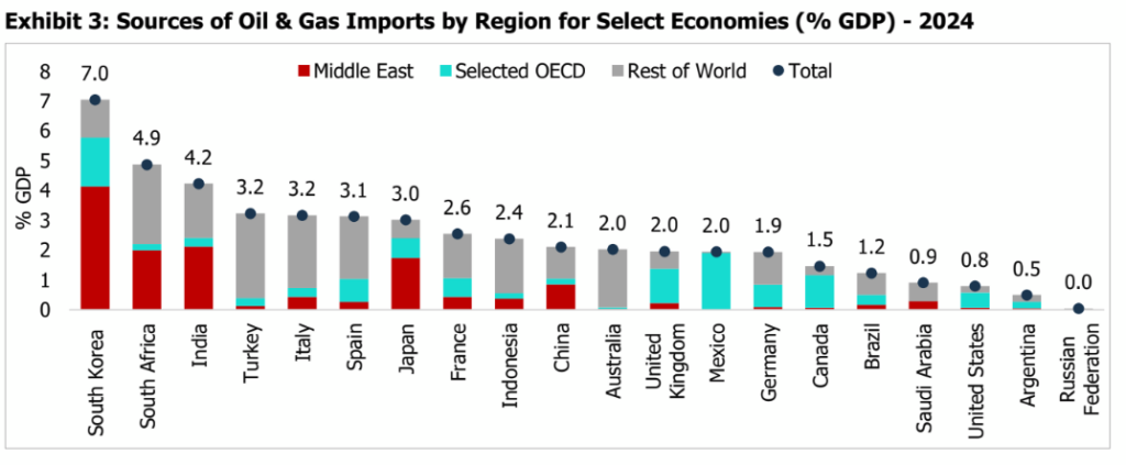 The ongoing conflict and potential damage to key energy infrastructure could disrupt supplies and pose significant risks to economies that depend on the region for energy imports. Several Asian economies, such as South Korea, India, Japan, and China, are vulnerable due to their relatively high energy imports from the Middle East (see Exhibit 3). India’s total oil and gas import dependency is estimated to be around 4.2% of its GDP (2024). Of this, reliance on the Middle East is estimated at about 2%.