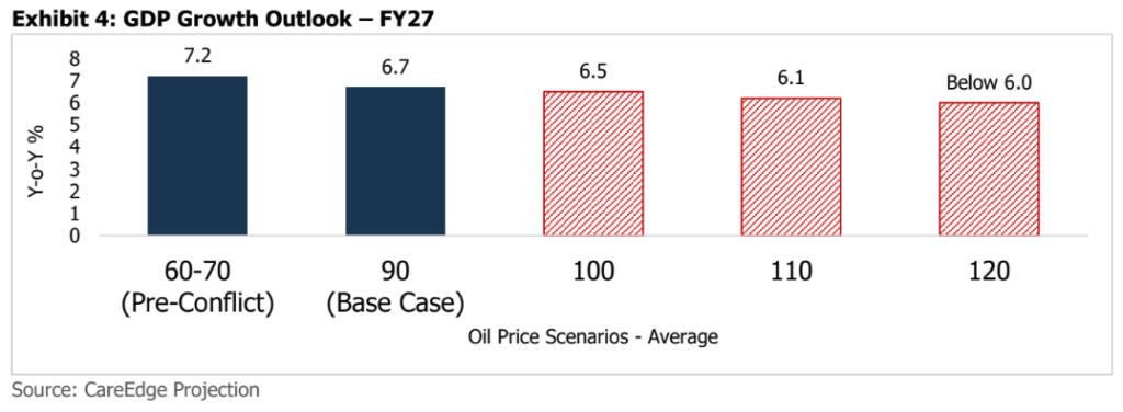 While domestic fundamentals remained relatively resilient in FY26, the escalation of conflict in West Asia has weakened the growth outlook, with the Indian economy likely to be affected through multiple channels. As per our baseline scenario for FY27, if the global crude oil prices average at USD 90/bbl for the full year, we estimate India’s GDP growth to moderate to 6.7%. This represents a downward revision from our pre-conflict growth forecast of 7.2% (assuming crude oil averaging between USD 60-70/bbl). Downside risks to India’s growth outlook persist, given the possibility of a prolonged war situation and higher energy prices. In an extreme case scenario where global crude oil prices average around USD 120/bbl in FY27, we see GDP growth dropping below 6% (Refer to Exhibit 4). Looking ahead, the overall duration of the conflict and the extent of its repercussions on the global supply chains are critical monitorables.