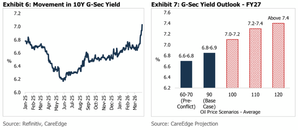 contributing to the rise in yields. As a result, the 10Y G-sec yield has risen 37 bps in March, crossing 7%, a level last seen in July 2024. Looking ahead, G-sec yields are expected to face upward pressure due to heightened global uncertainties, inflationary pressures, and rising fiscal challenges. We estimate the fiscal burden from the excise duty cut on petroleum products, along with the possibility of an increase in subsidy burden and lower tax revenue collections, to be around 0.5% of GDP in FY27. As per our baseline scenario, we expect G-sec yields to average 6.8 – 6.9% over the year, assuming early resolution of the conflict. However, should oil average USD 120/bbl through the year, rising fiscal pressures would push yields above 7.4%.