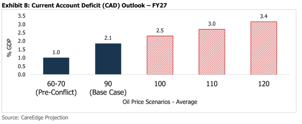 India’s current account deficit is expected to face challenges amid the ongoing global turmoil, given its high energy dependence. India is dependent on imports to meet about 88% of its total oil requirement and 51% of its gas requirement. Over the past five years, India has expanded its supply from the US and Russia. However, West Asia still accounts for a large 51% of India’s total crude oil imports. India imports 5.5–6 million barrels of crude oil per day. A USD 10 increase in crude prices could raise India’s import bill by around USD 20 billion. Given that India also exports a significant share of refined petroleum products, a USD 10 rise in crude prices could increase the current account deficit (CAD) by 30–40 basis points. Apart from crude oil’s impact, there are two additional risks stemming from the exposure of exports and remittances to West Asian economies. India’s merchandise exports to West Asia were USD 64 billion (14.7% of total exports) in FY25. Furthermore, India’s remittances remain vulnerable to shocks from the West Asia conflict, as the Gulf Cooperation Council (GCC) countries account for nearly 38% of India’s total inward remittances, amounting to more than USD 130 billion. Overall, factoring in global crude oil prices averaging at USD 90/bbl for the full year, along with some pressure on exports and remittances, we estimate India’s CAD to widen to 2.1% of GDP (Vs our pre-conflict projection of ~1%).
