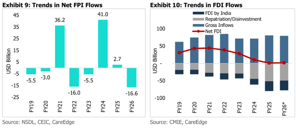 At a time when India’s current account is facing renewed pressure, driven by its high dependence on energy imports and challenges to exports, it is important to note that India’s capital flows have also come under pressure amid volatile FPI flows and moderating net FDI. India’s FPI outflows further intensified following the West Asia conflict, reaching USD 13.6 billion in March, the highest monthly outflow in the last six years. With this, FPI outflows for FY26 were recorded at USD 16.6 billion, as against inflows of USD 2.7 billion in FY25. Looking ahead, persistent global uncertainties, elevated crude oil prices, and rupee weakness are likely to keep investor sentiment cautious, weighing on the FPI flows. Furthermore, net FDI inflows (Gross inflows – Repatriation – FDI by India) have consistently been negative over the past six months. Higher repatriations and FDI outflows have been weighing on India’s net FDI inflows. During 10M FY26, India’s net FDI inflows were weak at USD 1.7 billion following a poor USD 1 billion in FY25.
