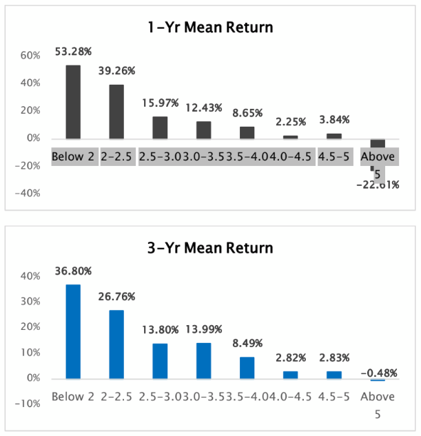 - Short-Term Risk: In 1-year horizons, buying at high P/B multiples (>4.5x) leads to a sharp increase in capital loss probability and negative skewness.