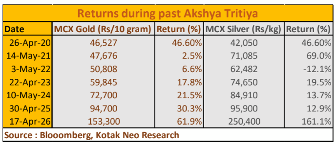 As India celebrates Akshaya Tritiya on 19th April 2026, retail investors are likely to turn their focus towards bullion once again for wealth creation purposes. Known as one of the most auspicious days in the Hindu calendar, Akshaya Tritiya celebrates prosperity and good luck. Tradition holds that buying gold during Akshaya Tritiya will bestow lasting riches upon the buyer. Sentiment surrounding gold as a wealth creation vehicle is further supported by price action in recent months. Gold has returned over 60% over the past year alone, one of its strongest annual showings in recent years. With geopolitical tensions continuing to weigh on investor sentiment, along with strong central bank buying and healthy investment demand, gold prices have surged, according to a report by Kotak Securities.