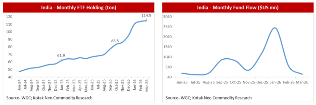 Gold ETFs in India witnessed fresh inflows in March 2026, extending its run of net positive additions for the eleventh month. Assets under management reached record levels while total inflows added 1.1 tonnes to reserves at US$176.6 million. This marks a sharp slowdown from the month prior driven by profit-taking from investors as prices reached lofty valuations. However, participation in gold ETFs continues to increase with the number of total folios rising to 12.1 million. Retail investors make up a key portion of this increase. For the first three months of 2026, gold ETF inflows remained positive overall aided by price strength and portfolio diversification needs. This saw total holdings rise to 114.9 tonnes while AUM climbed to an all-time high. Additionally, high prices and volatility saw investors both pile into gold ETFs and redeem on rises as investors have become more savvy in their approach to gold.