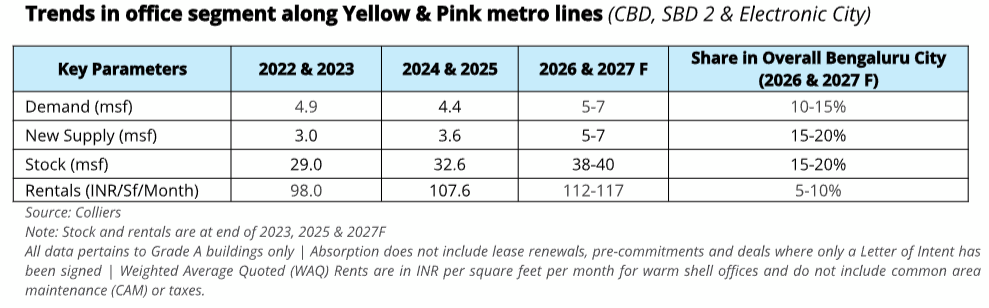 “The expansion of Bengaluru’s metro network is set to boost the city’s office market across key central & secondary business districts and peripheral locations such as Electronic City. The operational Yellow Line has already improved connectivity to Electronic City, the southern Technology hub of the city, boosting demand, while the upcoming Pink Line is expected to further enhance Grade A office uptake in its catchment areas. As commute time reduces and intra-city connectivity improves, the Bengaluru office market will witness strengthening of demand amid growing developer interest. Office hubs along the Yellow & Pink line are expected to account for 15–20% of the city’s total Grade A office stock by 2027 and witness a rental increase of 5-10% in the next 1-2 years.” said Arpit Mehrotra, Managing Director, Office Services, India, Colliers.