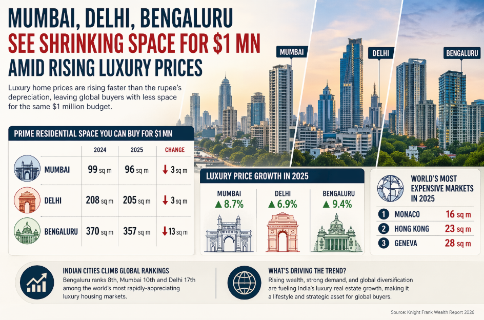 A $1 million budget doesn’t go as far in luxury real estate as it once did. The latest Wealth Report by Knight Frank shows that rising property prices are steadily eating into the amount of space buyers can get – even in India. While global hotspots like Monaco, Hong Kong and Geneva remain the most expensive, the same trend is now visible in Mumbai, Delhi and Bengaluru, where strong demand is pushing up prices and quietly shrinking the space available for the same dollar spend.