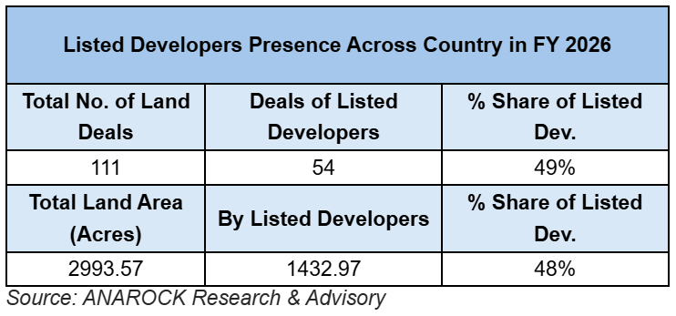 “Our latest data shows that listed realty players spoke for an impressive 49% share of all land deals in FY 2026,” says Anuj Puri, Chairman — ANAROCK Group. “This means that they drove close to one of every two land deals in this period. A total of 111 land deals covering 2,994+ acres were sealed nationwide for various real estate developments, with 54 deals over 1,433 acres executed by listed developers alone.”