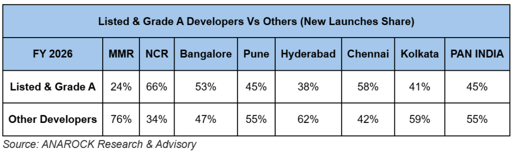 An analysis of the total new housing supply (units) across the top 7 cities in FY 2026 shows that the share of the listed and Grade A developers combined stayed high at 45%. Back in FY 2025, this share was slightly lower at 43%.